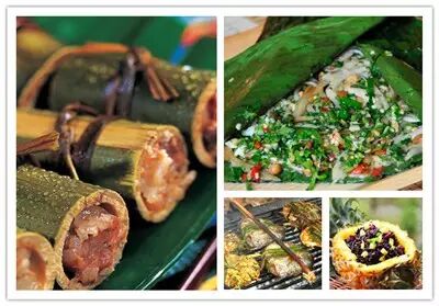 香竹饭,傣语称“考澜”,只能用具有特殊香味的香竹“埋考澜”煮制。香竹为乔本科竹类,杆细如酒杯,内壁粘有一层具有特殊香气的白色竹瓤。