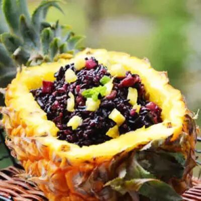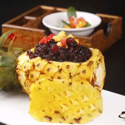 菠萝紫米饭甜甜酸酸,香而不腻,是西双版纳一种独具风味的食品,既是主食,也是菜肴。菠萝饭的外型是一只完整的菠萝,十分美观大方。