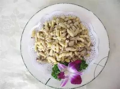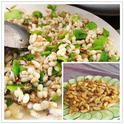 蚂蚁蛋在傣家是一道传统名菜,蚂蚁蛋豌豆大小,状如猪腰子,外观白嫩,表面有一层薄膜,味道鲜美,却极为难得。食用的蚂蚁蛋,都是生长在树上的大黄蚂蚁所产的。