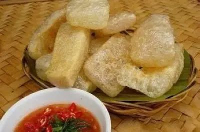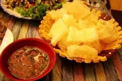 傣家炸牛皮色白如玉,松脆可口,配上傣族特有的各种喃咪酱蘸吃。常用的喃咪有番茄喃咪、牛肉喃咪、螃蟹喃咪等,别有风味,也可放入三鲜汤里煮吃。