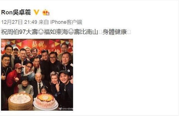 当天晚上,吴卓羲在微博上传大合影,合影照挤满了人,一眼看去有许多熟悉的面孔,包括今年刚刚在TVB颁奖礼拿下视帝的马德钟、苗侨伟戚美珍夫妇、陶大宇、梁烈唯、吴卓羲、陈山聪等香港著名艺人。