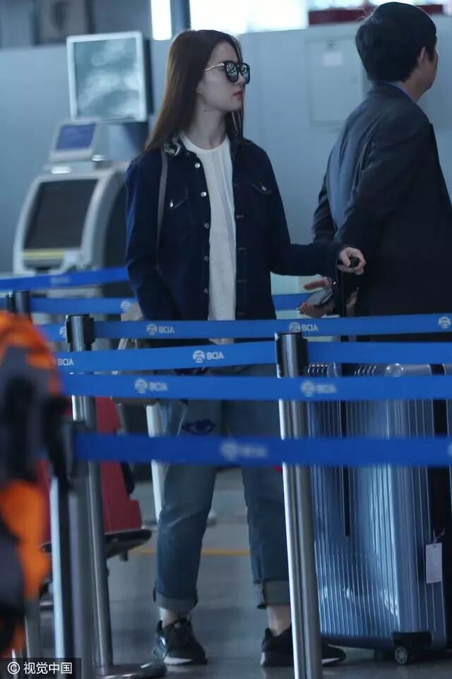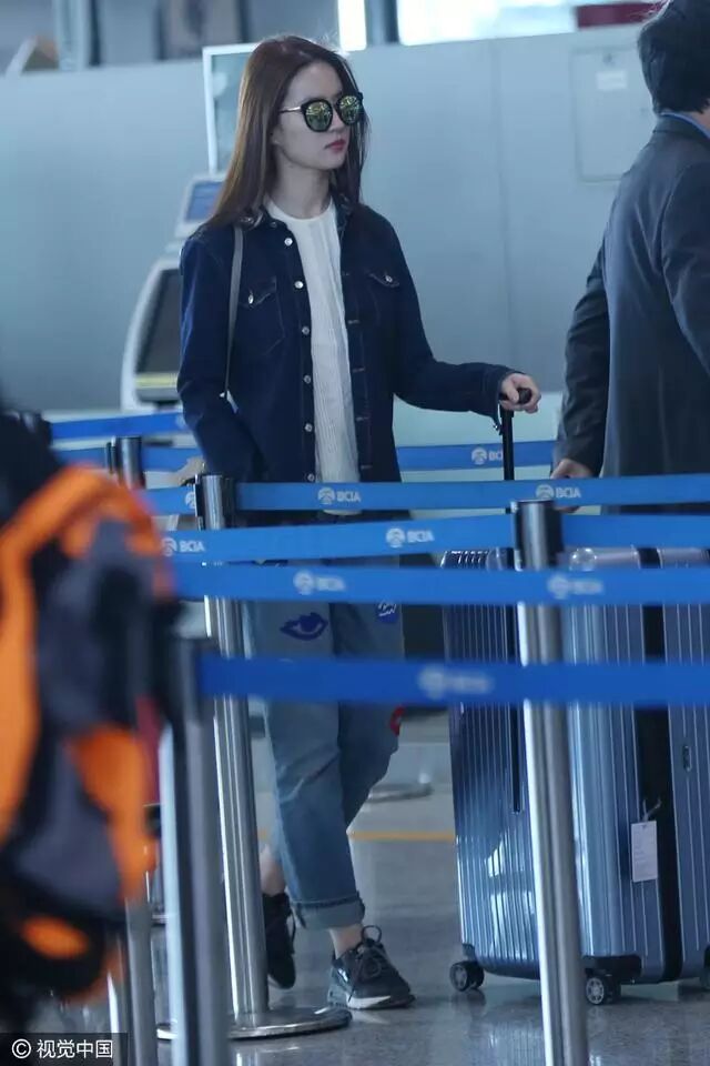 2016年04月19日讯,北京,4月18日,刘亦菲与母亲同赴香港,美貌基因再认证。刘亦菲穿着牛仔装戴着炫彩墨镜青春气息十足。 图片来源:视觉中国