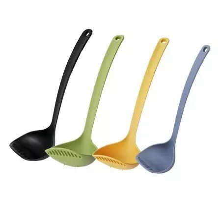 勺面前端带漏网设计,即可当汤勺也可当漏勺使用。勺子底面带凸点设计,可以捣碎较软性食物。(例:熬草莓等酱时。)