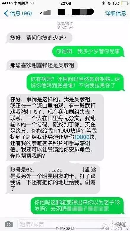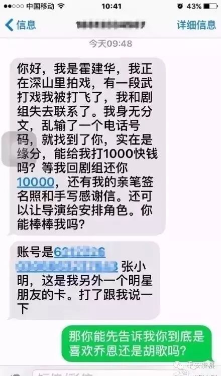 据@中警安徽,近日,网友曝光了这样一则诈骗信息。短信内容为:“你好,我是霍建华,我正在深山里拍戏,有一段武打戏我被打飞了,我和剧组失去联系了。我身无分文,乱输了一个电话号码,就找到了你,实在是缘分,能给我打1000块钱吗?等我回剧组还你10000,还有我的亲笔签名照和手写感谢信。还可以让导演给安排角色。你能棒棒(帮帮)我吗?”