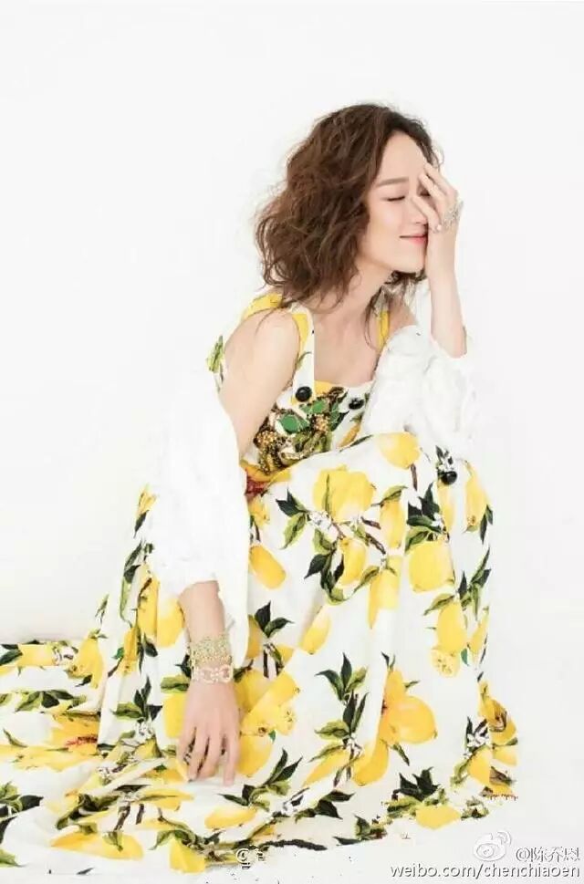 因为刘诗诗结婚而火了的这条黄色裙子,陈乔恩也爱穿,搭配白色的短衫,很青春活力。
