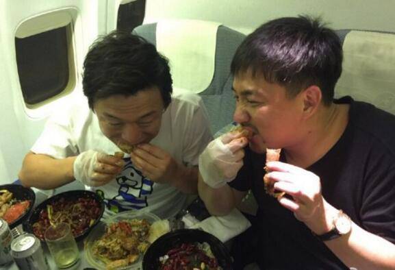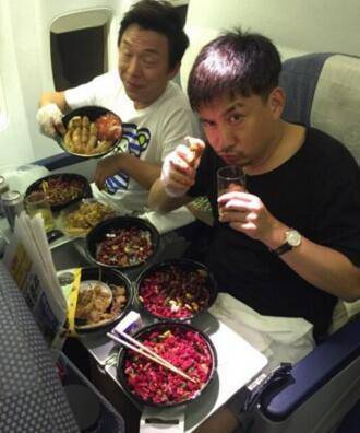 孙红雷在微博晒出一组《极限挑战》的人马在飞机上的照片。照片中黄渤与黄磊大开吃戒,吃得油光满面,一脸满足。黄磊和黄渤两人面前摆了一大桌美食,其中还包括皮皮虾,而两人吃的忘情,完全不计形象,画面太美,不敢看!