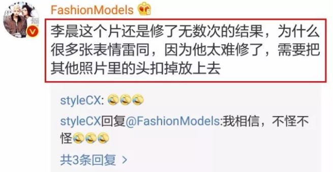看得出后期团队都用尽十二分精力让李晨看起来时尚那么一丢丢,但李晨粉丝并不领情,反而吐槽陈漫技术差?