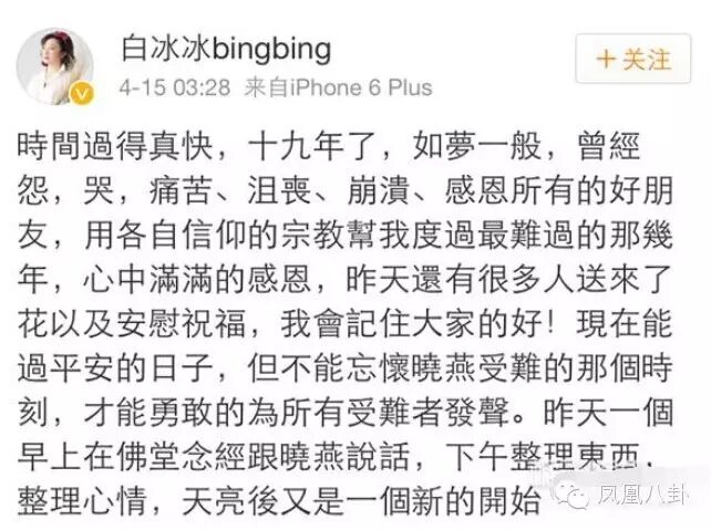 这条微博是她在悼念19年前去世的亡女白晓燕,19年了当年的白晓燕凶杀案在历史的洪流中被逐渐淡忘,但对于母亲来讲,这是永远都无法忘记的伤痛,而白冰冰这些文字也坚强得让人心疼。