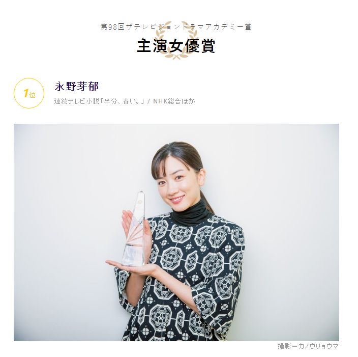 永野芽郁通过《一半,蓝色》获得了最佳女主角奖,被评价为“漂亮的女主角”。
