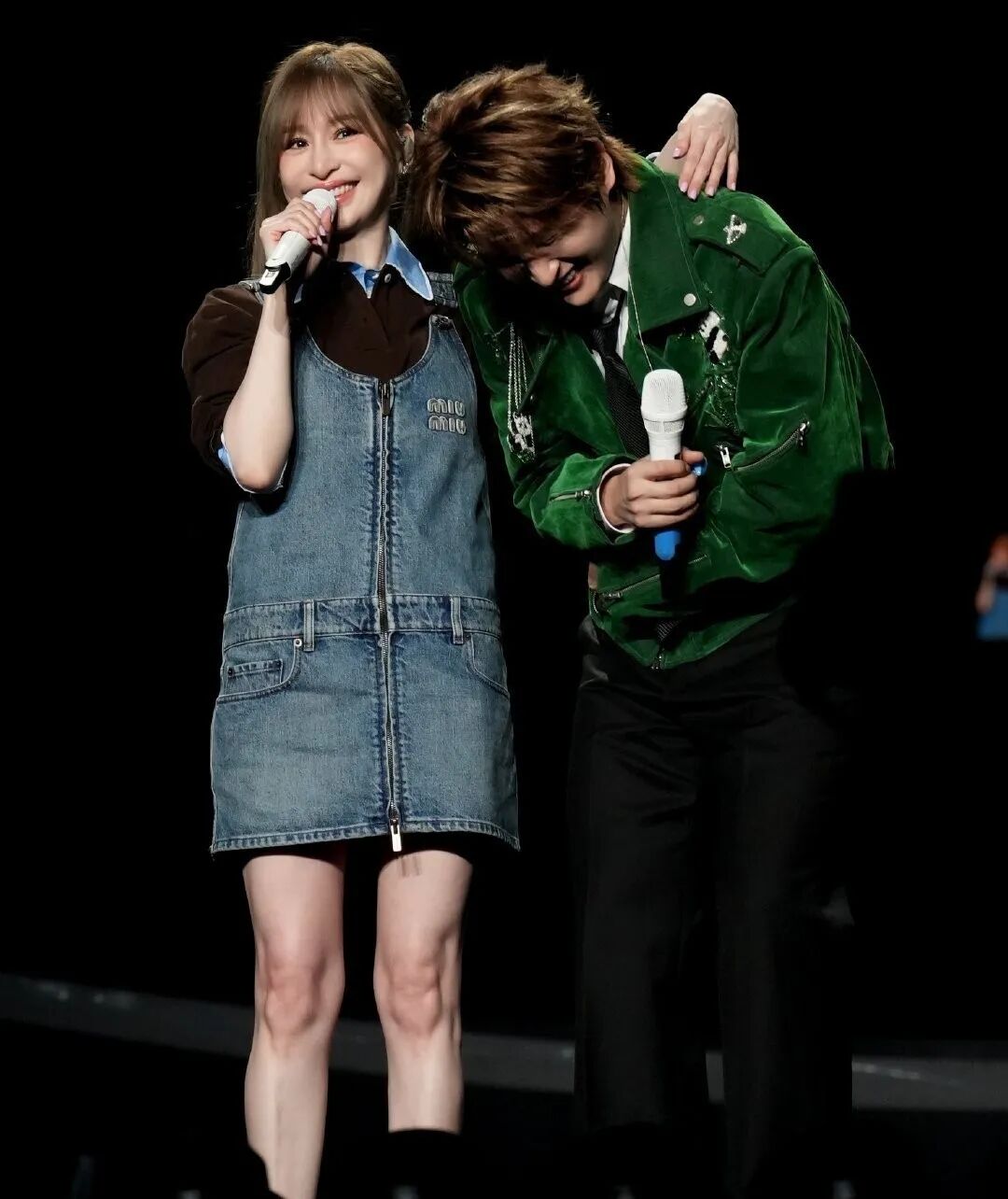 蓝黑拼接衬衫配牛仔背带短裙,双马尾编发随着《爱你》的节奏轻晃——这套让158cm穿出168cm既视感的造型,瞬间屠榜热搜。网友发现,当张远与"甜心教主"同台时,耳根通红全程低头,被调侃"霸总也扛不住初恋暴击"。