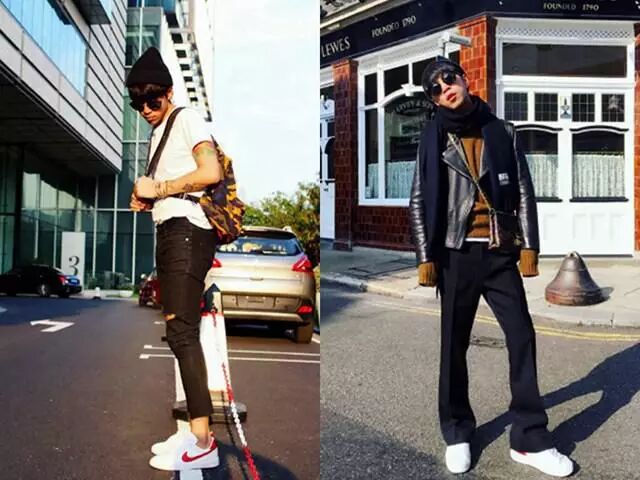 伟霆and耿乐一身黑的皮夹克,配了一双白色的sneaker,这样一来,反倒让人眼前一亮的感觉。感觉皮衣的硬气感都柔和了许多。