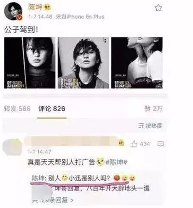 后来被网友吐槽要不要天天帮别人打广告啊?结果,陈坤是这么回的:别人?小迅是别人吗?好甜啊!