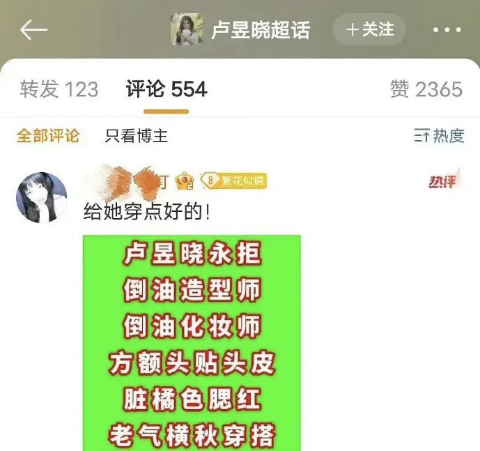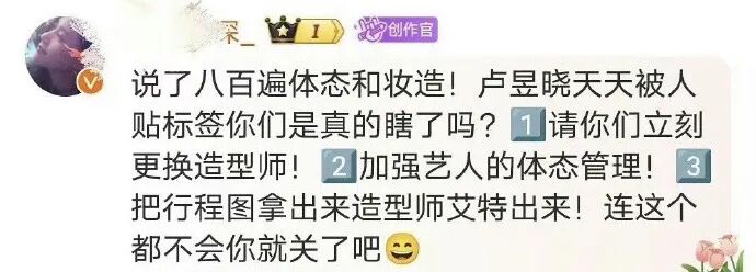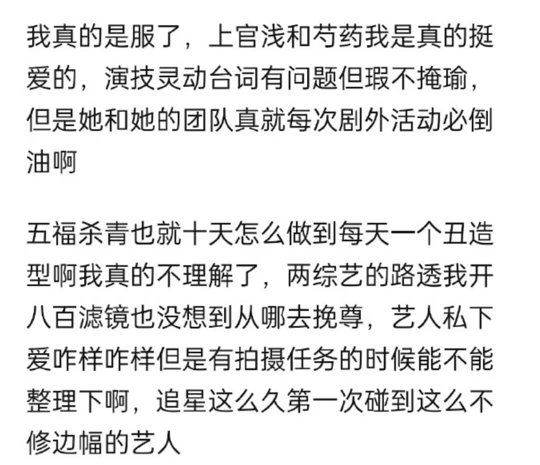 卢昱晓:我松弛我的,你审判你的 围剿白日梦 内地女星 2024-04-17 18:49:30 4 创作不易,用心坚持,欢迎请BaGua喝几杯爱心咖啡!打赏并支持本文 打赏并删除本文 点击上方蓝字“围剿白日梦”关注,欢迎把文章分享朋友圈。【围剿白日梦(微信号killdaydream)原创内容未经许可禁止转载,转载及合作请留言。在热搜上看到于正官宣《五福临门》全剧杀青的消息,阿杠的第一反应是:啊?才杀青啊?主演的杀青照不是月初就出来了吗?点进去才发现他们这个月一直在陆续杀青,群像剧不同支线是分开拍摄的。上周主创在苏州吴江录制团综,之所以有缺席人员(柯颖&梁永棋),就是因为这一对还在剧组拍收尾。但其他“四福”及她们各自的couple都是有到场的,卢昱晓&王星越、吴宣仪&黄圣池、刘些宁&陈鹤一、黄杨钿甜&董思成,就连在该剧扮演小丫鬟的赵晴也在。按照正常情况,这么多俊男靓女凑在一起逛古镇、露营、坐船游湖,而且还都成双成对的,最大讨论点理应是嗑糖相关吧?随手一拍就很登对。图经过站姐之手更是神级。偏偏网友们就是不按常理出牌,万万没想到这些天录制下来互联网讨论最多的是主演的颜值,话题主要集中在卢昱晓。首先我们看一眼争议始端——卢昱晓录制第一天的穿搭,简简单单的奶黄色衬衫套装叠加乳白色长款风衣。这套说多难看倒也没有吧,不过的确更适合私下穿,录节目的话,看起来没型,过于松垮也不够精致。生图直出被嘲体态不好。视频直截被嘲脸大如饼。全身镜头则是被喊话“该减肥了”。多审判几张路透你就会发现,根本不只是宽松显胖穿搭的问题,这个贴头显油发型和脏橘显黑妆容也很难评...这一身完全,从上到下、从头到脚、从里到外,无一幸免。网友的态度be like↓问责工作人员型:工作室的钱真好赚,发型师和服装师都不用找;造型团队在干嘛,实在不行穿私服上吧...问责艺人本人型:为啥总有不洗头的既视感,好邋遢;怎么在哪都是脏脏乱乱的感觉...甚至有网友为了吐槽她不修边幅,特意又创造出一个艺人派系——“邋遢系艺人”,表示娱乐圈普女明星很多,但卢昱晓是唯一一个让自己觉得邋遢的,每次刷到她都想发出“这是明星??”的感慨。生图里头发乱糟糟。(指邋遢人群中一眼认不出。(指普通衣服不摘吊牌。(指不讲卫生,因为新衣服她没洗就穿上了耳朵脏。(指不爱干净罗圈腿。(大概指体态差吧#不得不说,网友们拿着放大镜逐帧审判女明星是有一手的#演双簧似的:接“你懂什么,粉丝说这叫松弛感”,再接“这松弛感会不会有点太松弛了,还是紧绷点吧”...前有营销号发文唱衰,“《五福临门》真的是肉眼可见要完蛋了”;后有评论区网友附和,“卢昱晓颜值太普了,这种颜值演女主,内娱是真的要完了”。于·18g冲浪选手·正也闻讯赶来,在线怒怼营销号:说吧?收了谁的钱来黑!可是你如意算盘打错了,广告拉满了呢!S+了哈哈哈哈!#有时候真的很难不怀疑死丫头是不是在欢娱公关部兼职,他为自己的剧反黑未免太及时了吧?#虽然说卢昱晓这几张崩图的诞生不能完全怪妆造,但造型师确实也有责任就是了。当只拍到上半身,且头发放下来看不见发际线、光暗下来看不清妆容时,卢昱晓就好看起来了。或者换身装扮,卢昱晓就青春洋溢回去了。不敢说多吸睛,至少常规不出错。既然同样是团综拍摄期、同样是未修抓拍图的前提条件下,只需要换个妆造就可以做到不倒油,那这油是非倒不可吗?路透崩图流传开来后,卢昱晓工作室的评论区前排就迅速被维权心切的粉丝攻占了,又是要求工作室立刻更换造型师,又是强调卢昱晓的仪态管理需要加强。还有粉丝发小作文说自己第一次被丑脱粉,表示自己追星这么久第一次碰到这么不修边幅的艺人,并来了个质问三连:五福杀青也就十天,怎么做到每天一个丑造型的?艺人私下爱咋样咋样,但是有拍摄任务的时候能不能整理下?永远剧播吸粉剧外赶粉,能不能一辈子待在剧组别出来?脱粉小作文还附上针对卢昱晓该造型的锐评两则:发酵粉馒头、跟在王星越后边像他小婶婶。(爱之深责之切是吧普不普、丑不丑的,少说近几年娱乐圈被嘲过“普”的女艺人也得有个三位数了吧。小红书随手点开一个“比四普还普的女生”讨论帖,在评论区被提名到的就有:徐若晗、庄达菲、李浩菲、张淼怡、徐梦洁、任敏、李庚希、宋伊人、沈月...甚至刘浩存近几天有张电影杀青照是素颜,也被很多网友说太普了,四普应该有她的位置。不是?刘浩存刚出道就被列入小花颜霸line了,我以为她的漂亮是公认的,居然有一天她也能被质疑外表啊...只能说大家都有自己的审美,无论觉得一个人好不好看,都只是一种主观上的想法,没有正确答案,只有大部分人和小部分人。可互联网刚流行起用“普女”来形容女明星时,明确表明过,这个词通指外表并非大美女却非要营销自己是大美女的艺人啊。(srds这种说法我也不太认同,美它不应该有统一标准所以什么时候开始“普女”变成一个纯粹的容貌定义词了?不管凹不凹美女人设,瘦、高、白、大眼睛、高鼻梁、高颅顶,只要有任何一样没沾到都会被挑剔样貌、打为“普女”。阿杠印象里,卢昱晓既没演过绝世大美女,也没营销过自己是天下第一美人,但她自从靠着《云之羽》热度起来后,身上关于“普不普”的争议基本就没断过。上官浅的扮相现在是总被网友拉出来说是卢昱晓的颜值巅峰期,放眼