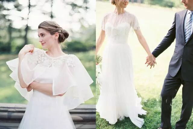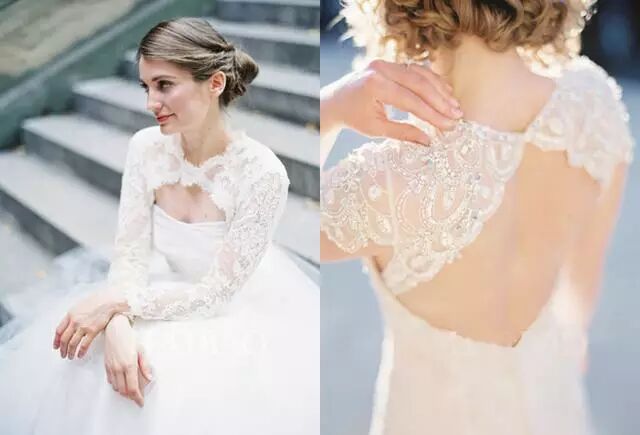 有的姑娘她们想在婚礼时展现姣好身材,又想在婚纱上别出心裁。蕾丝性感婚纱小外套满足你!比如一件露背婚纱,搭配设计独特的颈部系扣小外套,可以展现新娘背部的完美线条。