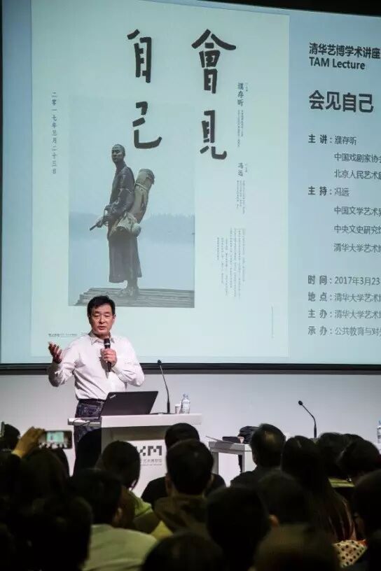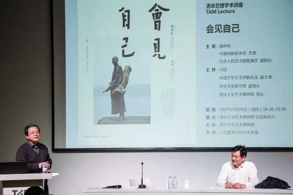 2017年3月23日晚18:30-20:30,中国戏剧家协会主席、北京人民艺术剧院副院长、著名演员濮存昕在清华艺博四层报告厅,为380位观众带来一场声情并茂的艺术讲座——《会见自己》。讲座由清华大学艺术博物馆馆长冯远主持。