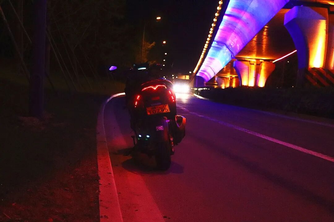 往下看一对射灯很显眼,可能会有人问,既然这么牛逼的小钢炮为什么还要加灯呢,我来告诉你,草蜢原厂的卤素灯在城市代步确实已经足够了,但是为什么还是会加装射灯呢?因为当你夜间骑行在国道上对面迎面而来一辆开着灯光的车,那时你就是瞎子,你说危险不危险?射灯就可以避免这种情况发生,同时还会让人感觉你的车更加饱满有逼格,贴心小提示:注意安装的位置,射灯开启时不要能直接射到对面的驾驶室,照射角度一定要低一点。