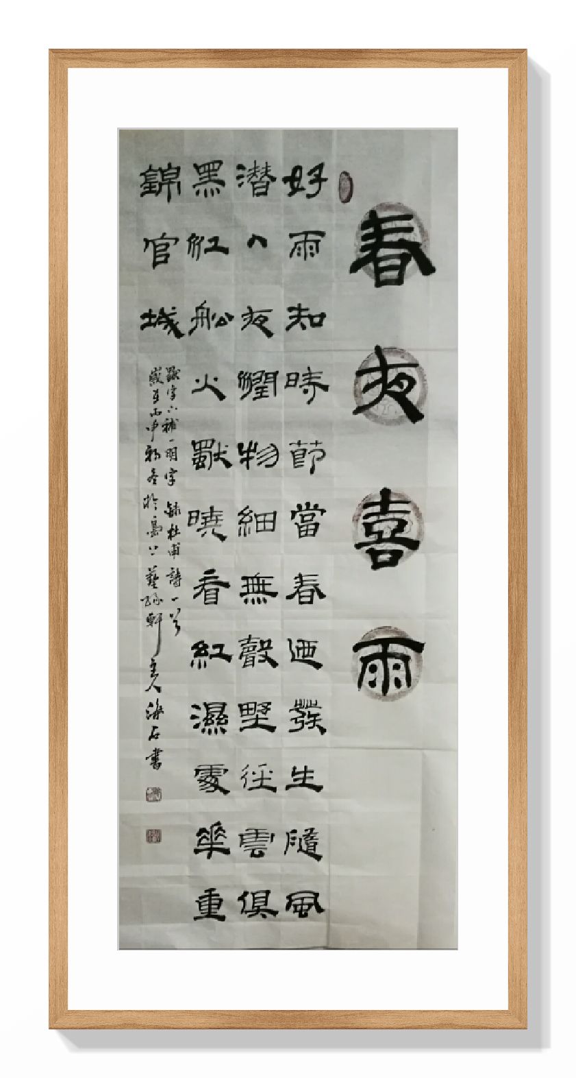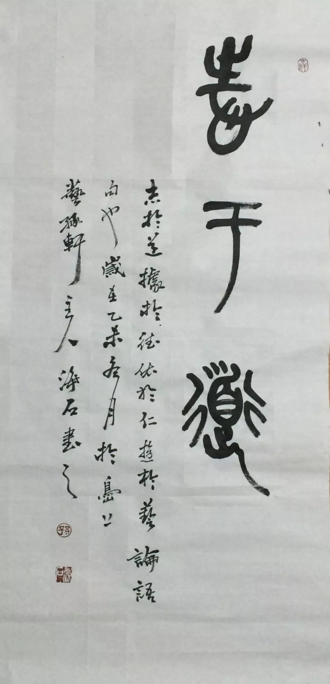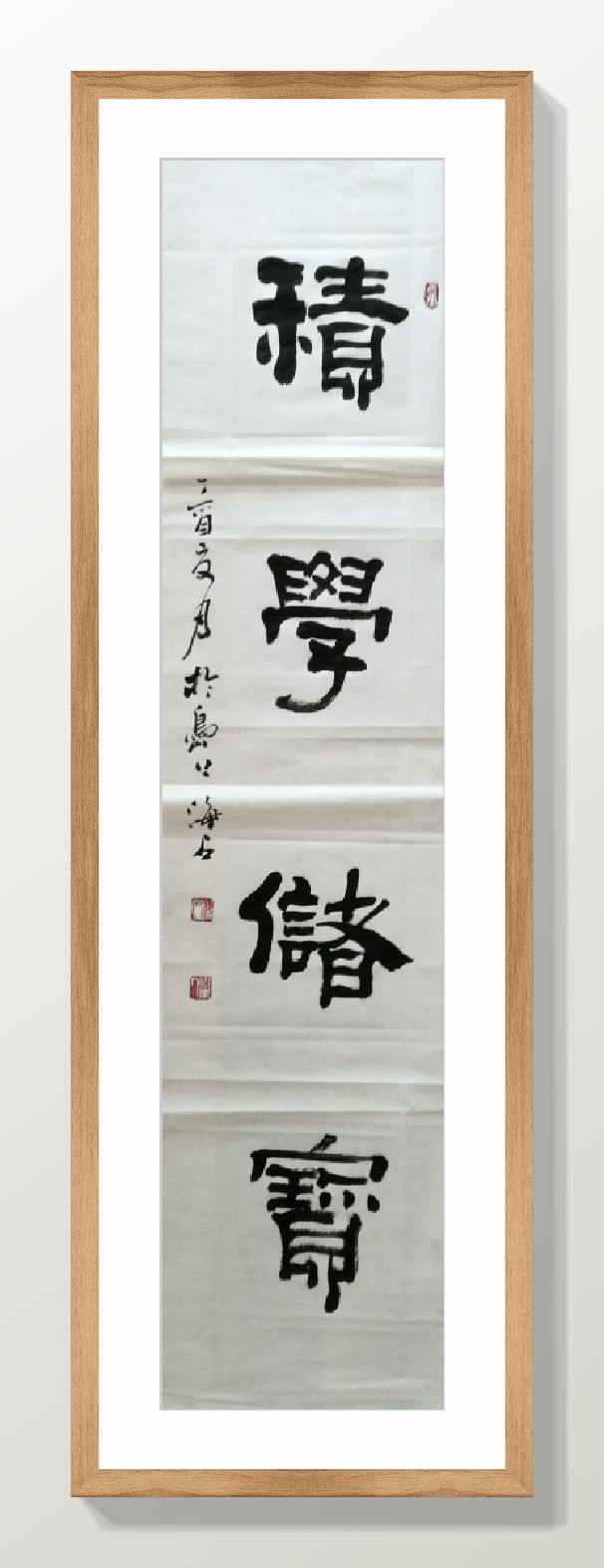 书法作品以篆、隶为主,兼写行、草、汉简。生活中,通过不断临习和研究《散石盘》、《石鼓文》、《毛公鼎铭文》、《石门颂》、《曹全碑》、《乙瑛碑》、《郑文公碑》、《张猛龙碑》等碑帖与现代诸多名家范本,为他的作品奠定了坚实的书法基础。他的篆书现秦汉遗风,以笔代刀,独具特色,极赋现代艺术美感。隶书追《大开通》之大气,求《石门颂》之洒脱,溶《张迁碑》之凝重,刚柔并济,稳重洒脱,独具匠心。