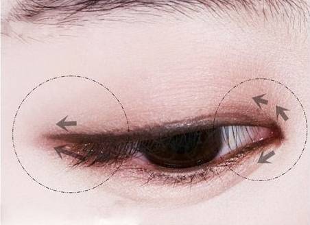 将淡棕色系的眼影沿着图中所示的范围,按照标志的方向涂抹。在眼周涂抹深色眼影,利用眼部的阴影效果增加双眸。浅棕色晕染也不会造成太明显的妆容效果。