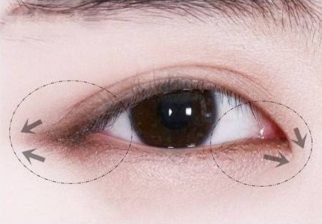 用深棕色眼影在眼头和眼尾处涂抹。在涂抹的时候尽量在图示范围内,渐变出层叠的效果才能很好的展现眼睛的深度。