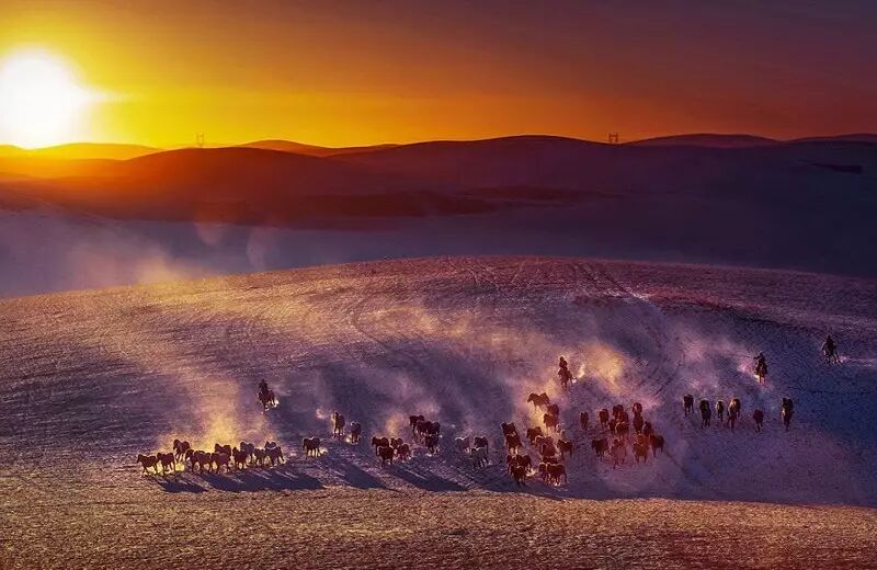 夕阳西下,奔驰的骏马扬起的黄尘和这片土地一样厚重。