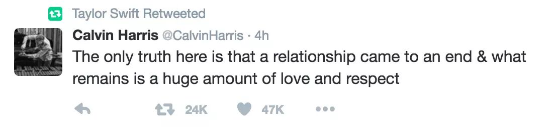 6.3日,霉霉又双叒叕分手了~Calvin Harris在Twitter证实两人已经和平分手,霉霉也转发了这条消息。