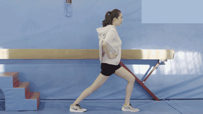 ① 两手叉腰,一条腿向前迈出半步做屈膝的动作,感受到另一条小腿拉紧的感觉了吗?