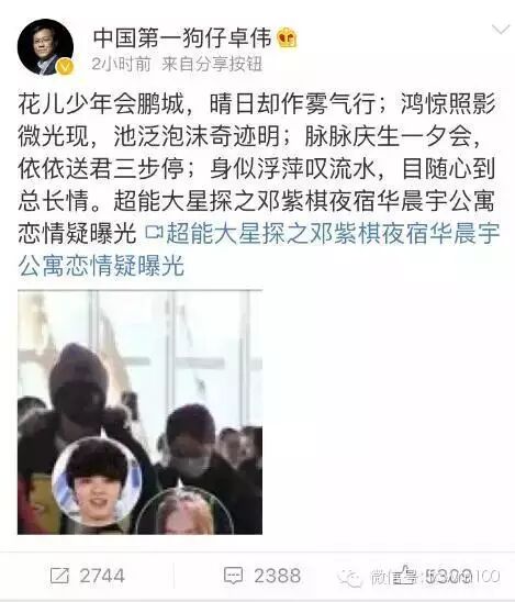 好久不出招的第一狗仔今天文采翩翩的曝光了皮裤小天后邓紫棋与火星系快男华晨宇的新恋情。标题是介样的"邓紫棋夜宿华晨宇公寓恋情疑曝光"