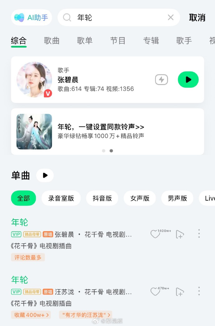 7月25日上午,在QQ音乐及网易云音乐应用的歌曲《年轮》搜索界面中,张碧晨和汪苏泷版本均被标为原唱。