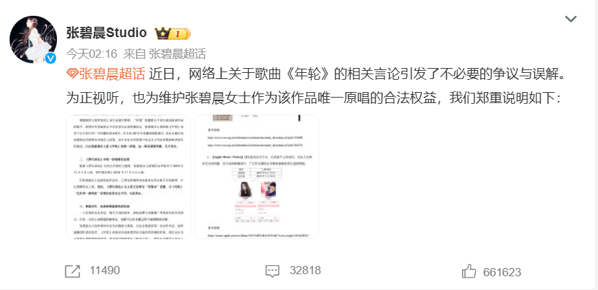 张碧晨工作室在微博下留言,值此《年轮》发行十周年之际,与这首作品告别,希望争议就此画上句号。
