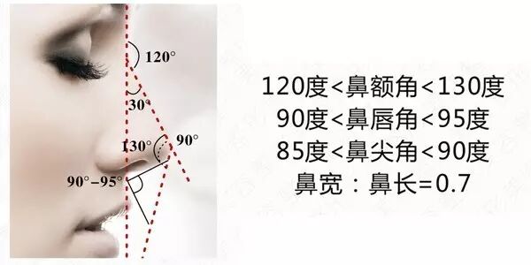 我们亚洲人的面部五官不像欧美人那样深邃有轮廓感,相比较而言,我们更偏柔美。对于亚洲人的美鼻鉴定,主要是看鼻子的形态在面部整体形态中的比例是否协调,按照90°鼻唇角,120°鼻额角,23mm鼻尖高度等标准判断。