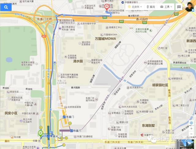 路线:乘坐地铁2号线或13号线东直门站,2号线B口或13号线G口出站,出地铁站后步行路线见下图: