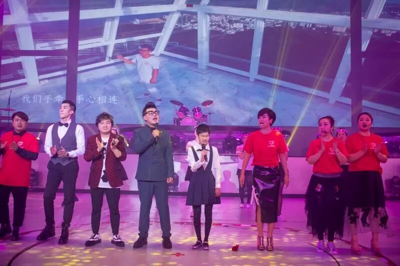 同心义工社受资助的成员们来到舞台与歌手共同演唱《让爱洒满人间》、互动,其乐融融的氛围中也传达了对同心义工社朋友们的爱心。
