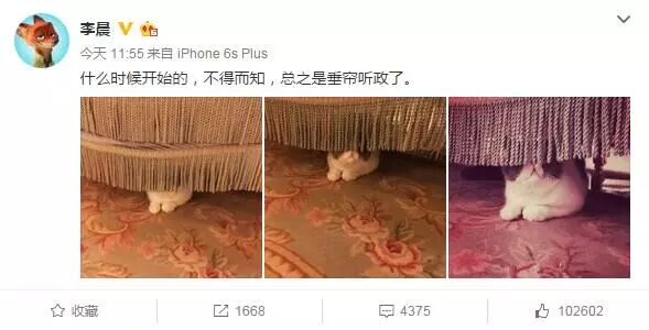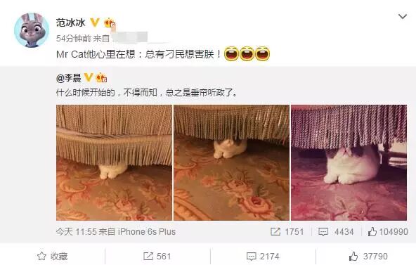 在照片中,范冰冰的猫咪躲在窗帘后面,镜头更是一步一步拉近。李晨配文称:“什么时候开始的,不得而知,总之是垂帘听政了。”范冰冰也转发了照片,并打趣称:“Mr Cat他心里在想:总有刁民想害朕!”两人又开始甜蜜虐汪。