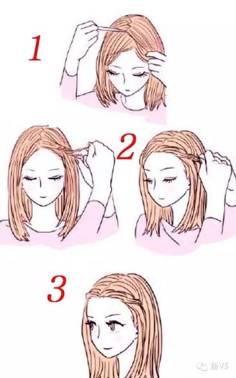 (1、打乱中分线,将刘海以 Z 字形的方式重新分成中分,分别从两边靠近刘海的部位拿起 2-5cm 范围内的头发,然后顺时针旋转编到耳后即可。