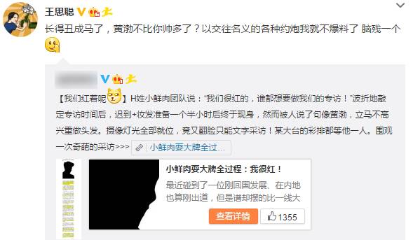 腾讯娱乐讯 昨日晚间,有媒体出了一篇爆料H姓小鲜肉耍大牌的文章,一时间引起网友关注热议。今日下午,“娱乐圈政委”王思聪发微博,炮轰该男星,称:“长得丑成马了,黄渤不比你帅多了?以交往名义的各种约炮我就不爆料了!脑残一个!”“政委”再放炮,引起网友热议讨论。