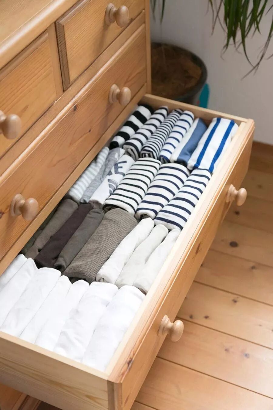 2. 折叠区的T-shirt叠起来竖着放进抽屉里,比平铺叠起来更方便拿取。