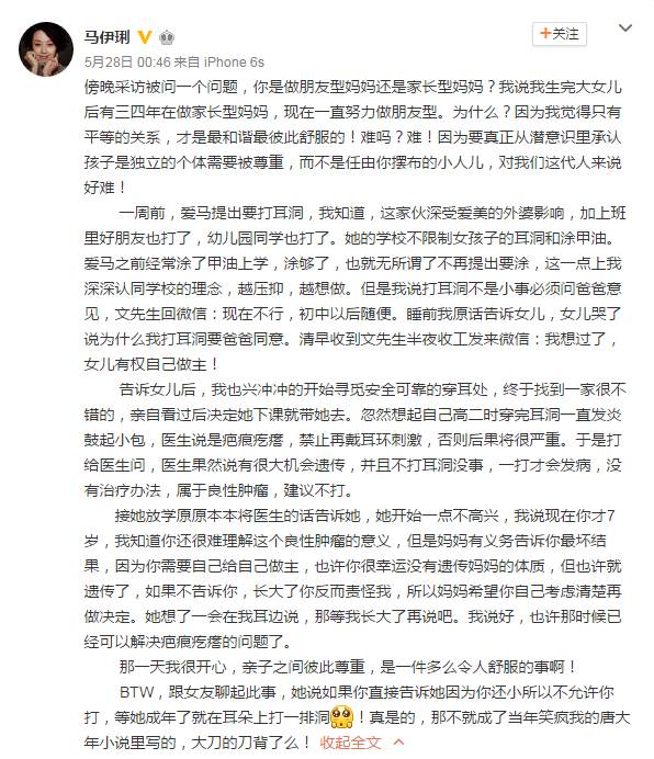 7岁女儿要打耳洞 看马伊琍如何教育孩子赢得彼此尊重 腾讯儿童 内地女星 2016-06-22 18:21:34 277 创作不易,用心坚持,欢迎请BaGua喝几杯爱心咖啡!打赏并支持本文 打赏并删除本文 70、80后的父母更加独立、更加强调平等,教育孩子更加尊重孩子的想法。当你真正尊重孩子后,会发现亲子间的关系是那么亲密有爱,令人舒服!5月28日,马伊琍发长文谈对大女儿的教育问题,坦言生完大女儿后有三四年在做家长型妈妈,现在一直努力做朋友型。马伊琍大女儿爱马要打耳洞,征得爸爸文章同意后(爸爸起初不同意最终也是让女儿自己做主)马伊琍自己寻找安全可靠的穿耳处准备带女儿去。因自己疤痕疙瘩穿完耳洞会发炎鼓包,询问医生后得到的答复:“有很大机会遗传。”马伊琍把医生的话告诉女儿,让7岁的女儿自己做决定,爱马最终放弃打耳洞。马伊琍在文末感叹:亲子之间彼此尊重,是一件多么令人舒服的事啊!不得不对马司令竖起大拇指,作为娱乐圈一本活的育儿经,马伊琍一直在做正面积极的引导,这次谈及和孩子的沟通,完美的诠释了什么是真正的尊重孩子。每个孩子都是被需要尊重的独立个体龙应台曾说:“儿子是一个自由的人,是我生命中相遇的‘另一个人’,我无权强令他做什么,只能和他进行朋友似的交谈。”马伊琍也说,自己现在一直努力和女儿做朋友。因为只有平等的关系,才是最和谐最彼此舒服的。但她也坦言“要真正从潜意识里承认孩子是独立的个体需要被尊重,而不是任由你摆布的小人儿,对我们这代人来说有点难。”再小的孩子都需要尊重。孩子的思想和思维是独立的,从孩子离开母体的那一刻起,他就是一个独立的人,并不是父母的附属品。美国父母和孩子的相处模式美国的父母,他们和孩子说话时,不但会看着孩子,而且还会蹲下来同孩子保持一致的视线。他们也很反对父母在人前教子,更不允许当面斥责孩子“没用”、“笨蛋”、“胆小鬼”。美国父母尊重孩子,不仅是因为孩子是弱势群体需要爱护,还在于把他们当做一个独立的个体看待。他们认为孩子有自己独立的思想和个性,无论谁都没有权力去支配或限制孩子的行为,包括父母和老师。当父母真正意识到这点的时候,就不会因为他的身高体重落后邻居家孩子而焦虑,也不会因为孩子内秀的性格不出众而埋怨,更不会因为他成绩平平而心灰意冷。他独一无二的个体存在性,本身就是最值得骄傲的。给孩子自己做决定的机会分享给大家一个故事。朋友在刚搬去美国时,带儿子去邻居家玩,主人很热情的拿出糖果给孩子,她下意识的婉拒说:“不用了,他不吃糖,谢谢!”过了一会,主人问孩子想要喝水还是果汁,妈妈又立刻回应:“不用管他,他不需要。”邻居特别奇怪,我问的是孩子,为什么你都替他回答了?朋友这才感到不好意思。主人再次问了一遍小朋友,小男孩特别开心的回答:“我要果汁。”美国大人不会代替孩子回答问题,“不吃”、“不要”这类的话几乎不会出现,也不会在孩子表达自己愿望的时候对孩子呵斥。现在作为家长的我们,小时候过节串门,想吃的巧克力和果冻的时候,大人总会摇摇头说:“不能拿,要有礼貌。“即使亲戚塞给我们,最后也只能在妈妈的要求下不情愿的还回去。那时候特别不明白:为什么不可以?当我们童年是这样度过的时候,我们这代人当了父母会更加懂了,孩子想要什么、想做什么是值得尊重和鼓励的。孩子有需要,只要不是原则性的问题或危险的事情,为什么不能放手让孩子自己做决定呢?当然,孩子年纪尚轻,离不开父母的帮助,选择过程中,父母虽然不替孩子做最后的决定,但是可以给孩子分析各方面的利弊,让孩子充分考虑综合情况再作决定。像马伊琍的方式,她没有用成人的思维直接告诉女儿,因为你还小所以不允许打耳洞,而是把打了耳洞后可能会产生的不良结果告诉孩子。她说:“知道你还很难理解这个良性肿瘤的意义,但是妈妈有义务告诉你最坏结果,因为你需要自己给自己做主。也许你很幸运没有遗传妈妈的体质,但也许就遗传了,如果不告诉你,长大了你反而责怪我,所以妈妈希望你自己考虑清楚再做决定。”这样做,是从小教孩子独立思考、把握轻重缓急,也让孩子了解:你要为自己的行为负责任。再分享一个故事给大家。孩子每天早上会喝鲜奶,母亲通常会提前取出,常温放置15分钟左右再给孩子喝。那天孩子特别心急一取出就想喝,母亲起初告诉他:”太冰了,你现在不可以喝!“因为母亲的直接反对,孩子反抗的很厉害。父亲说:”就让他喝吧,或许他觉得太冰就放弃了。“母亲让孩子摸了一下冰冷的牛奶外包装,然后告诉他:”你可以喝,也许喝了没事,但也可能会拉肚子,到时候你不能埋怨任何人,因为这是你自己选择的。“孩子答应了,当天下午真的拉了肚子,还好不严重。孩子蹲在马桶上,歪着脑袋笑着和母亲说:”妈妈,下次牛奶还是放一会再喝吧。“那一刻,孩子知道母亲当初的反对是为他好,他也为自己的行为买了单。如果早上母亲一直苦口婆心的告诉他不能喝,相信孩子的情绪是单纯负面的不理解。但和他平等的沟通过后,他会自己分辨清楚事情该如何处理。这一路,大人们总是希望孩子们听话,但忽略了孩子才是自己生活与成长的主角。孩子喜欢自己搭衣服,颜色不协调又何妨?男孩子稍微内向一点不爱运动又何妨?也许他有他自己的小世界呢。爸爸