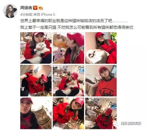 “世界上最幸福的职业就是这种猫咪咖啡店的店员了吧…我上辈子一定是只猫,不然我怎么可能看到所有猫咪都觉得很亲切”周扬青微博中写道。