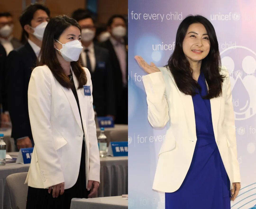 白色麦昆小西装,之前出席香港国际人才高峰论坛,以及UNICEF香港委员会35周年慈善晚宴时也都穿了。