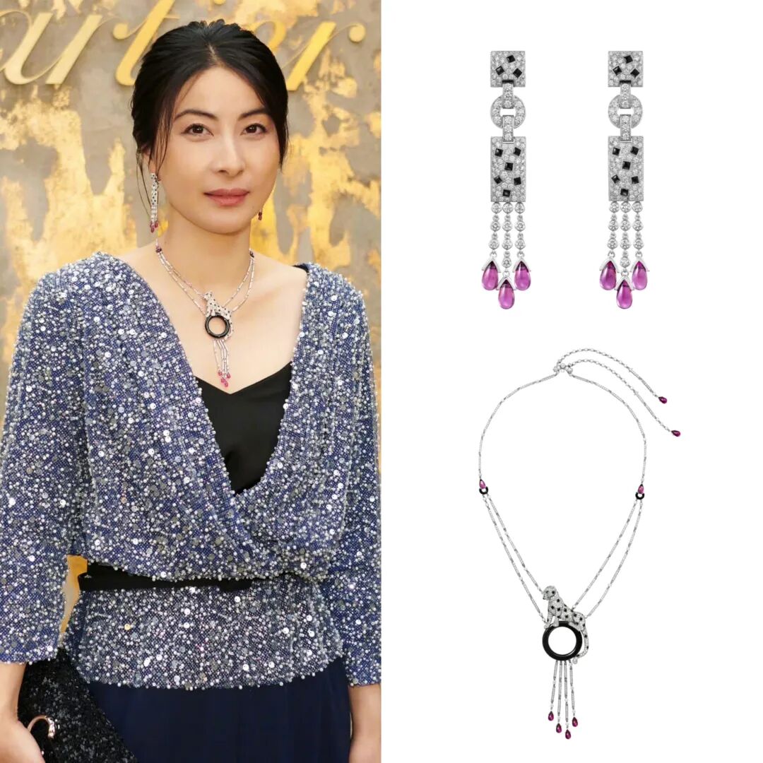 当天她还佩戴了卡地亚高级珠宝系列MIROITEMENT项链及戒指、MANOUR耳环及REPTILIS腕表,也是轻松驾驭。