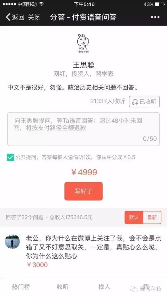 近日,“国民老公”王思聪在“分答”的32个问题,刷爆了朋友圈,其中不乏“择偶标准”、“避孕”等私密问题。当然了,王思聪也不是无偿的满足大家的“窥私欲”,他是要收费的。截止到5月30日,这32个问题共让他赚了17多万
