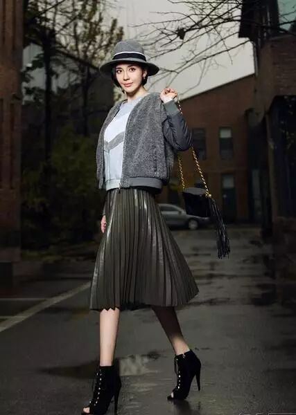 灰色卫衣搭枪色百褶半裙,这一身阴沉却魅力十足的造型,穿在171cm的吕佳容身上非常相配,流苏链条包和露趾绑带高跟鞋也非常吸精哦~