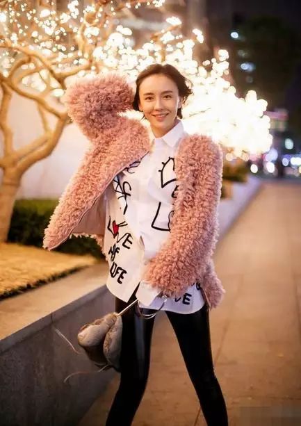 吕佳容除了脸蛋好看,笑容更是满分!而且白色字母衬衫与黑色皮裤的搭配很时尚,粉嫩的毛绒外套又增添了不少可爱与甜美。