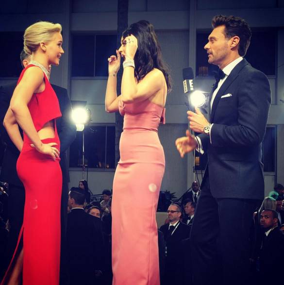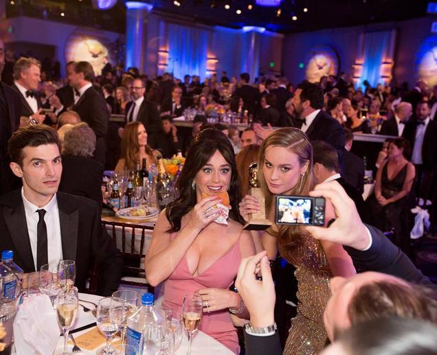这位合照的女粉丝是当晚金球奖剧情类最佳女主角Brie Larson。后来她说,这一幕是她在今年金球奖上最难忘的一段,她居然看见水果姐当着大家面,吃着热乎的汉堡。