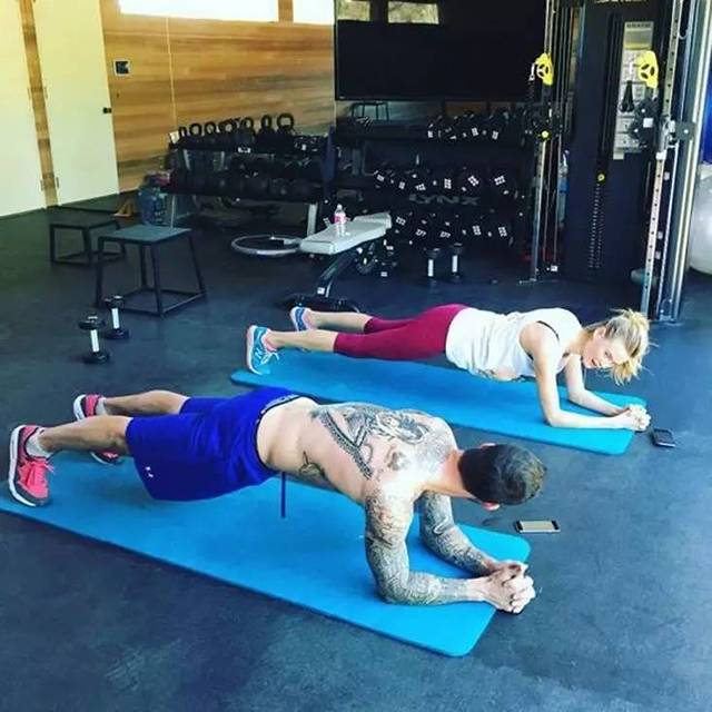 和Adam恋爱后,还不忘带着Adam一起做运动,随处随地都是两人的健身房。