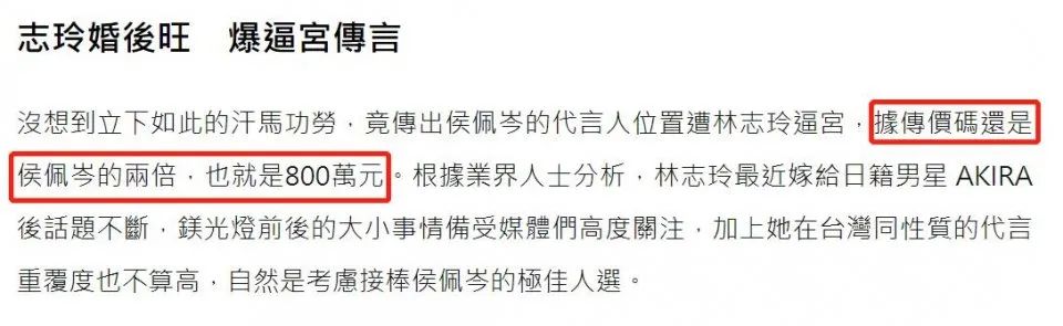 10月6日,据台湾媒体报道,近日侯佩岑的一款保养品代言被林志玲逼宫,差点被抢走,一度威胁到了侯佩岑的地位,还传出林志玲的代言费是侯佩岑的两倍。