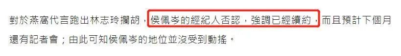 虽然传出林志玲截胡了侯佩岑的代言,不过侯佩岑的经纪人否认了这一事,强调已经续约,预计下个月有记者会,侯佩岑的代言并没有被抢。