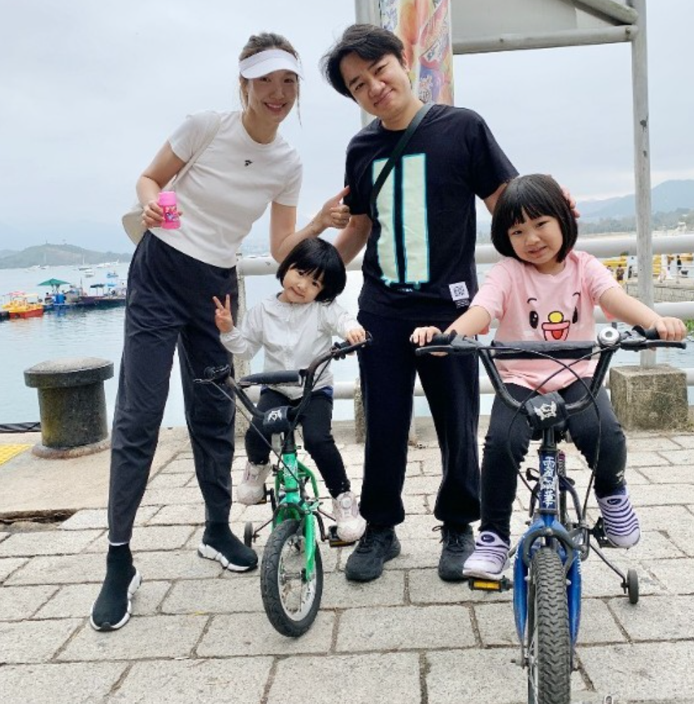 艺人王祖蓝近年主力内地发展,为工作一家人移居上海生活,前几个月趁新年一家四口返港过年。他与太太李亚男趁住假期,带同5岁大女王天韵(Gabby)及3岁细女王海静(Hayley)到大美督踩单车,夫妇二人沿途看实囡囡,祖男手上更挽住2个卡通水壶,供囡囡饮用解渴。