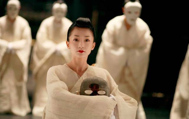 电影《夜宴》中,周迅唯美地表演越人舞,美术设计在定妆时便要求她把眉毛剃掉,化偏白底妆,突出红唇,代表着她对爱情的坚贞以及能为爱付出所有的决心。