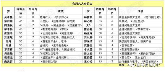 而台湾偶像“北上”之后,身价数倍翻。《步步惊心》热播的时候,网络上流传这样一份台湾演员内地拍戏片酬价目表: